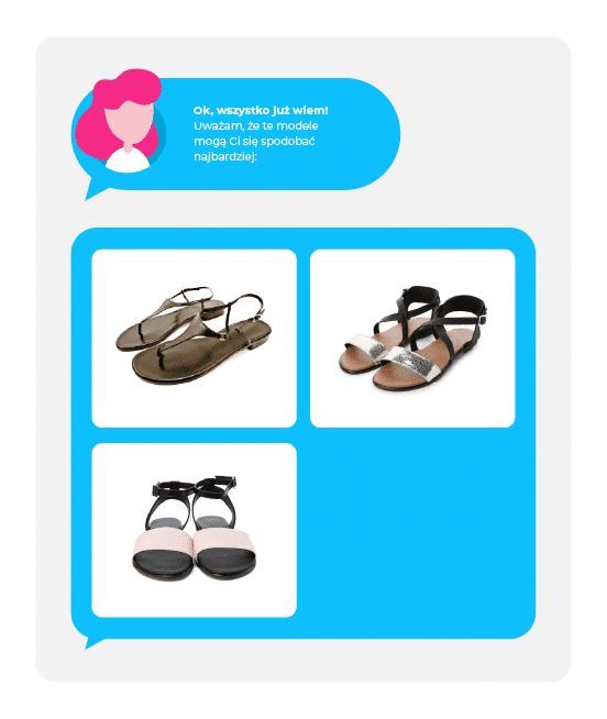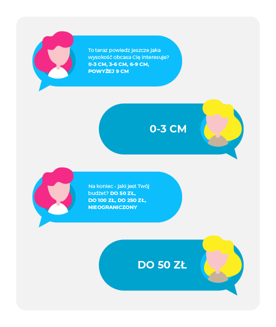 Wszystkie te cechy można wyklikać w filtrach wyszukiwania produktów, ale bardzo często użytkownicy mogą się w tym zgubić – zwłaszcza jeśli asortyment sklepu jest szeroki. Właśnie wtedy do akcji powinien się włączyć automatyczny konsultant proponujący pomoc. To jak bardzo zaawansowany scenariusz ułożysz zależy tylko od Ciebie, pamiętaj aby odpowiadał przede wszystkim na realne pytania i problemy Twoich klientów.